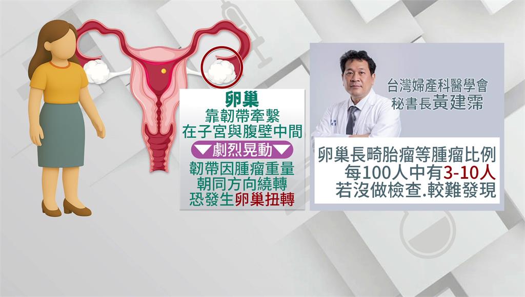 醫生指出卵巢有畸胎瘤等腫瘤的比例,其實不在少數。圖/台視新聞醫師點出,像卵巢有畸胎瘤等腫瘤的比例,其實不在少數,大概每100人之中,就有3到10人,而且大部分的個案,如果沒有做檢查,通常不會發現。醫師強調,一般民眾還是可以正常運動,但要是運動後,腹部劇痛太久,就得提高警覺,萬一發生錯位,就要緊急手術。