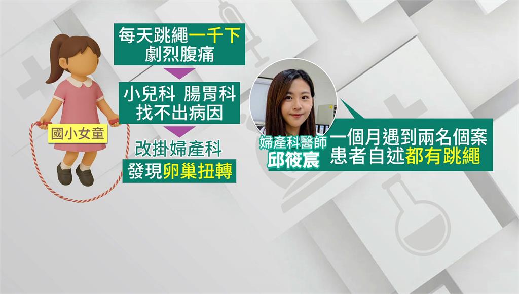 過去有研究發現,跳跳繩有助長高,但有國小的女童,每天認真跳跳繩一千下,卻導致腹部劇痛,看了小兒科、腸胃科卻始終找不出原因,直到掛了婦科門診做檢查,才發現是「卵巢扭轉」。