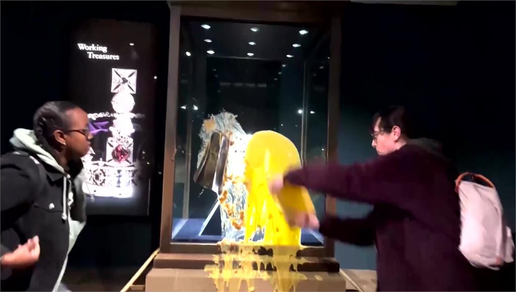 抗議者以甜點猛砸英國王室「帝國王冠」的展示櫃。圖/路透社