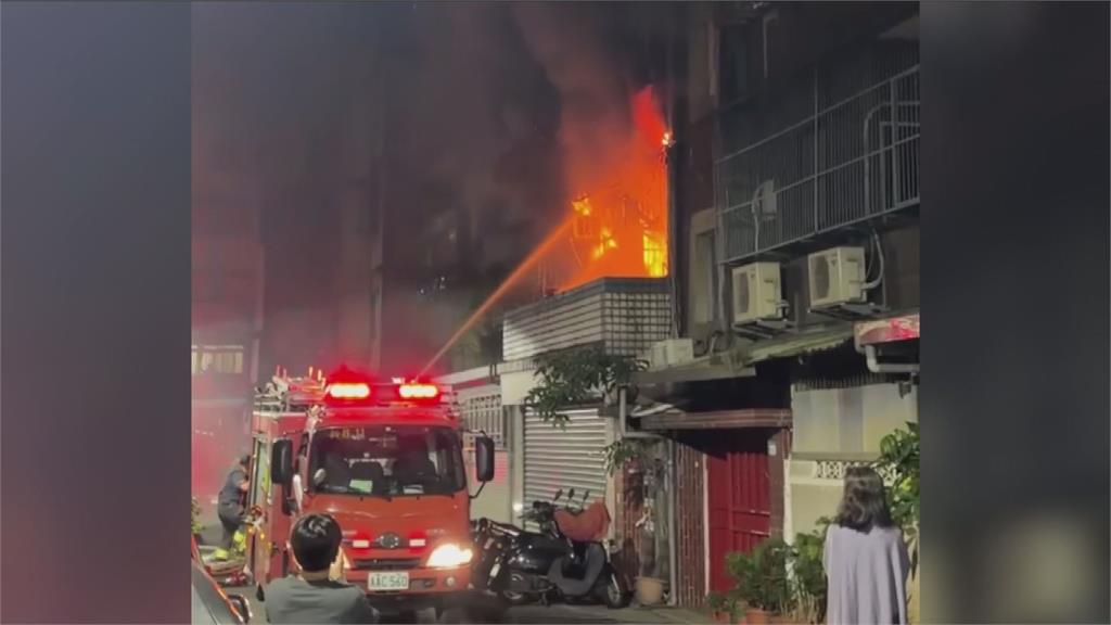 火光從二樓公寓窗口不斷竄出,消防人員射水灌救。圖/台視新聞