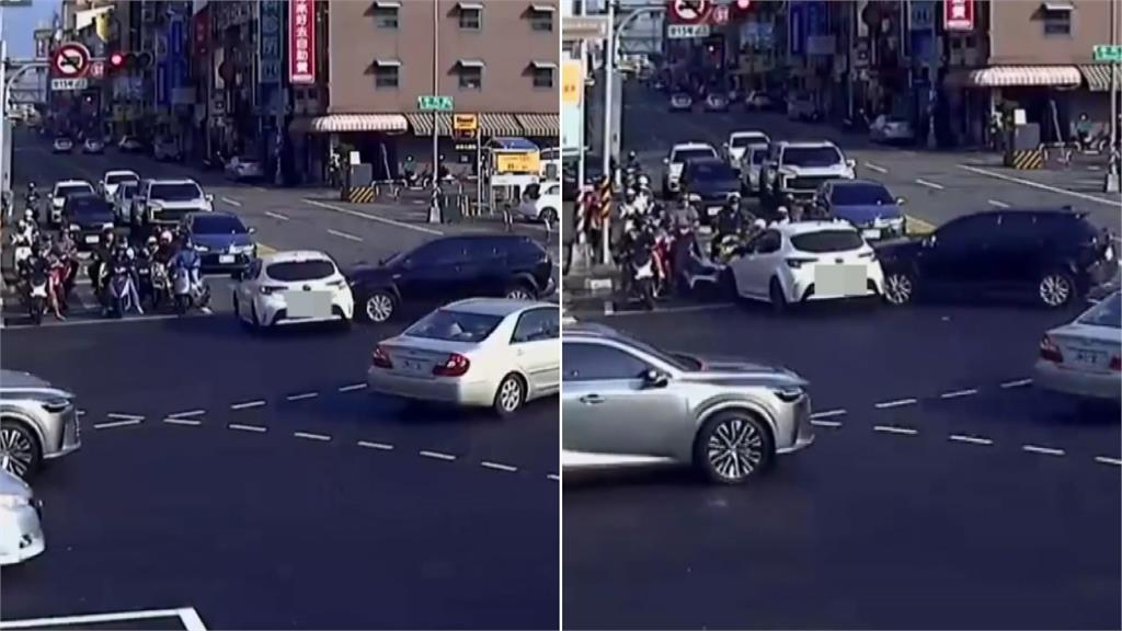 轎車搶快左轉遭直行車撞上,再撞倒待轉騎士。圖/台視新聞