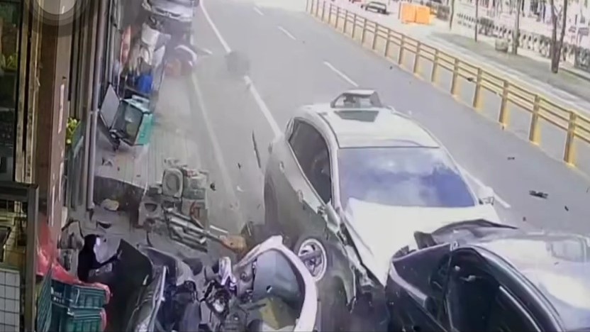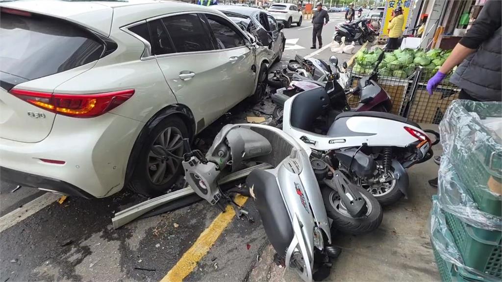 基隆發生嚴重車禍。圖/台視新聞 基隆市仁一路今(15)日上午11點多發生嚴重車禍,轎車駕駛疑似毒駕,車輛過彎後越開越偏,高速衝撞路邊的行人後,再撞停放在水果攤前的整排機車和兩部轎車。撞擊力道之大,現場一片狼藉,嚇壞所有人,其中遭撞的1名行人失去生命跡象,送醫宣告不治,還有2人輕傷。撞擊瞬間。圖/台視新聞多台機車被撞倒。圖/台視新聞※台視新聞提醒您,保護自己、遠離毒品責任編輯/施佳宜