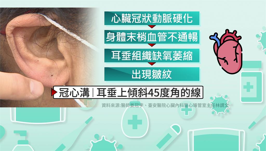 有醫師指出,警訊之一就是「耳垂上的摺痕」,耳垂上這條傾斜45度角的線便是「冠心溝」,當心臟冠狀動脈硬化,導致身體末梢血管不通暢,耳垂組織就會缺氧、萎縮,容易形成皺紋。