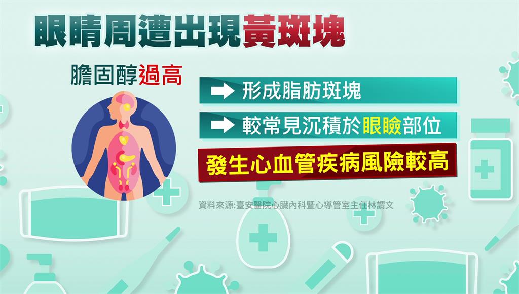 「眼睛周圍的黃斑塊」也是警訊。圖/台視新聞醫師強調,就算身材苗條、天天運動,外觀體態看起來正常,但體內也可能壞膽固醇過高。一旦出現頭暈、脖子緊等症狀,建議就醫檢查,避免心血管疾病危機。