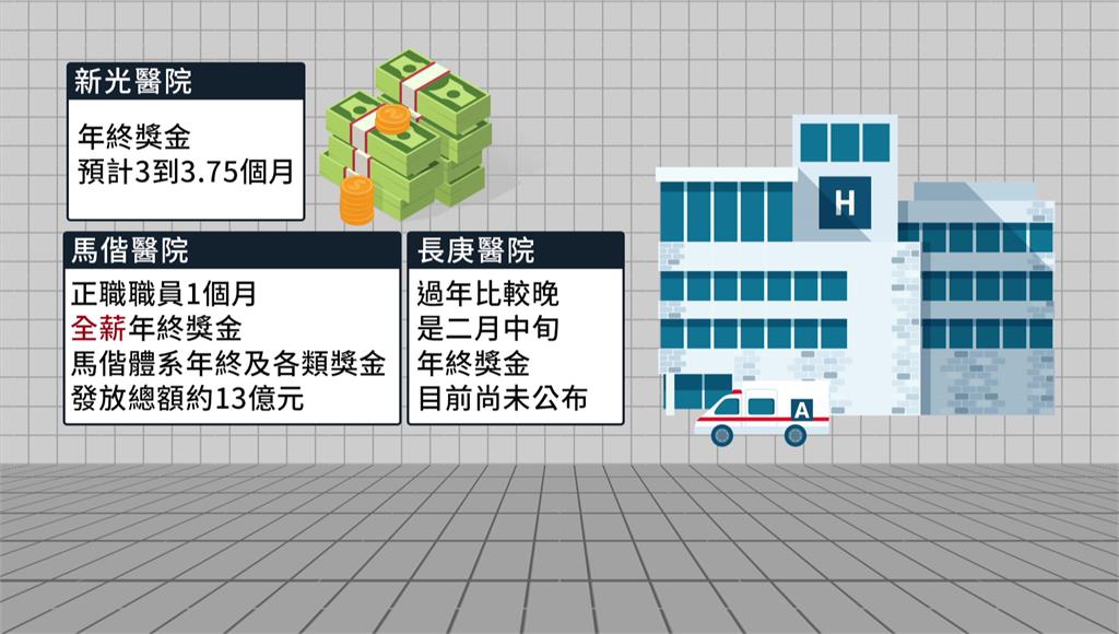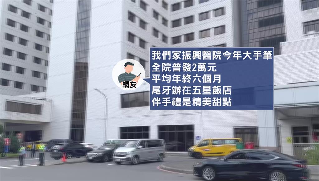 振興醫院證實有普發2萬現金,前年、去年也都發放6個月年終獎金。圖/台視新聞其它醫院方面,新光醫院,預計發放3到3.75個月的年終獎金;馬偕醫院則是針對正職職員將發1個月的全薪年終獎金,各院區發放總額約13億元;長庚醫院,則說因為過年比較晚,目前尚未公布年終獎金金額。