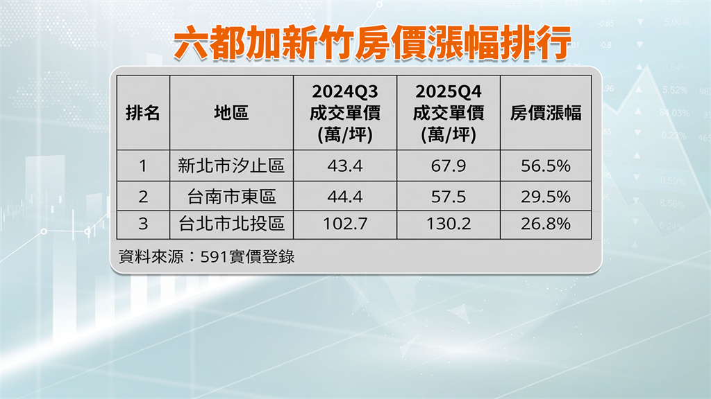 六都和新竹房價漲幅。圖/台視新聞陳炳辰認為,2025年走向價量背離,雖然在量體上有減弱的狀態,但很多的區域還創造出區域高價。房價難降,但量縮已經造成房產業者反彈,如何找到平衡點維持金融穩定,持續考驗央行智慧。