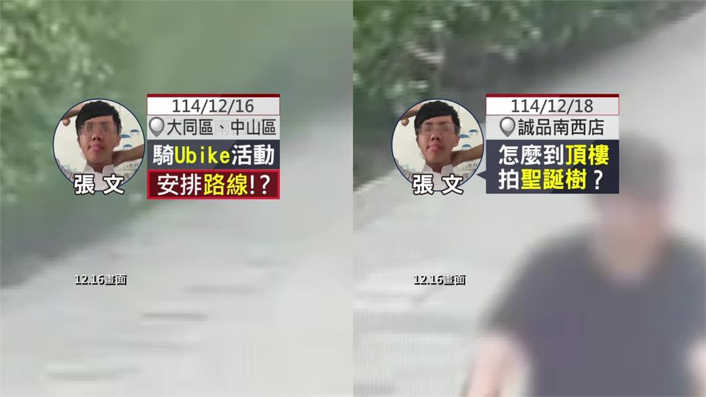 案發前3天,張文騎Ubike在大同區、中山區閒晃,還到誠品百貨南西店詢問店員怎麼到頂樓拍聖誕樹。圖/台視新聞19號下午3點多,張文陸續跑到中山區三個地點,燒了5台汽機車;短短14分鐘內,他丟了6個汽油彈縱火。