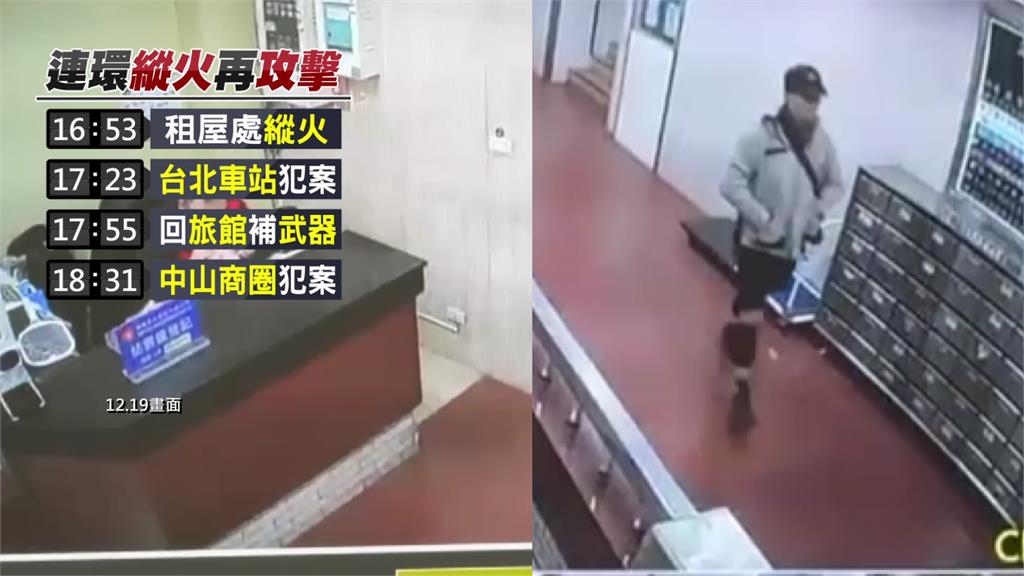 3次縱火之後,他改騎Ubike回公園路的租屋處換衣服,離開前又放火,燒了3樓陽台的雜物。台北車站丟煙霧彈殺人後,監視器拍下他竟然還折回大同區的旅館,他所投宿的房間幾乎像小型軍火庫,補充煙霧彈後,他又走到中山商圈再犯案。