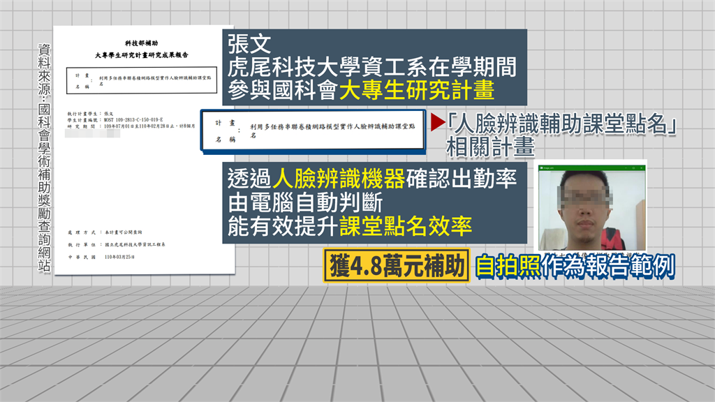而張文就讀虎尾科大資工系時曾參與大專生研究計畫,報告題目聚焦在「人臉辨識輔助課堂點名」,研究動機中提到,希望透過人臉辨識機器確認出勤率,由電腦自動判斷提升課堂點名效率,內容中他還使用「自拍照」作為示範範例,而這份研究最後獲得國科會補助新台幣4萬8千元。