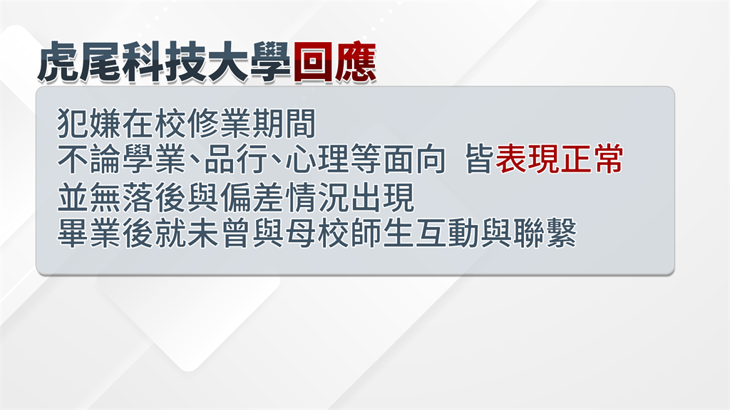 虎尾科大秘書室公共事務組組長張逸品則說,根據獎懲紀錄以及輔導紀錄都顯示正常,後續會配合警方提供的相關資料協助釐清案情。
