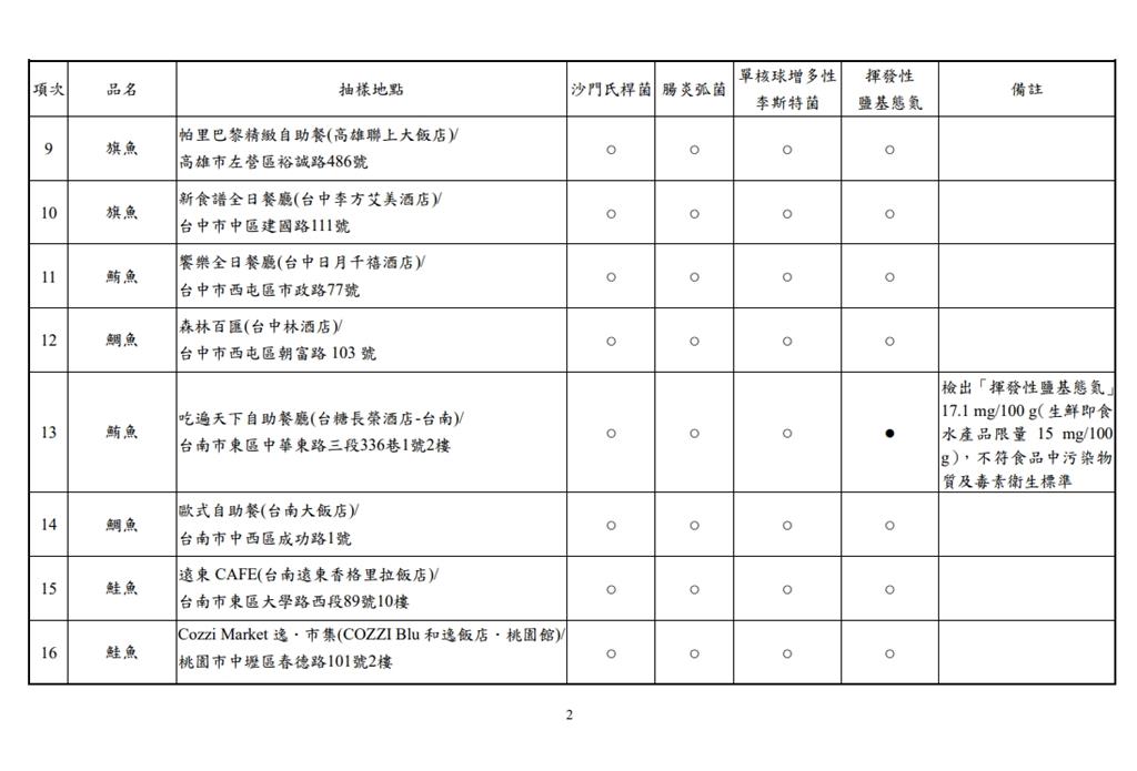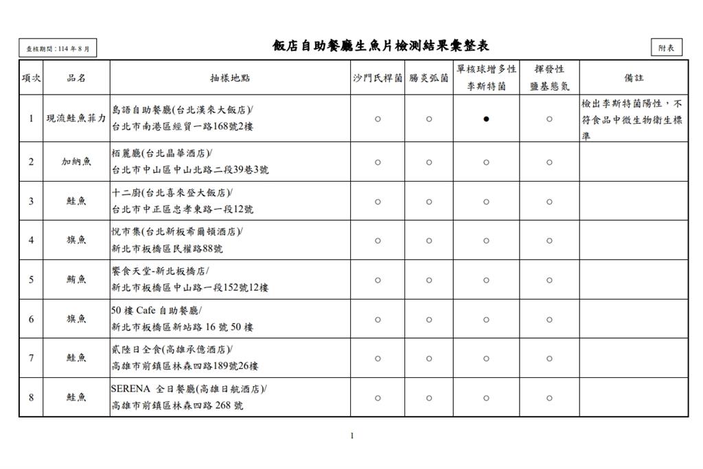 消保處在今年8月,針對六都共18家飯店的生魚片進行抽驗,當中「沙門氏桿菌」及「腸炎弧菌」全數符合規定;「單核球增多性李斯特菌」及「揮發性鹽基態氮」檢測部分,各有1件不符合規定。