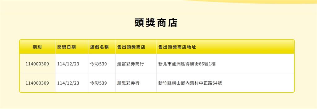 今彩539頭獎開出2注。圖/台彩台彩12/23獎項獎號如下: