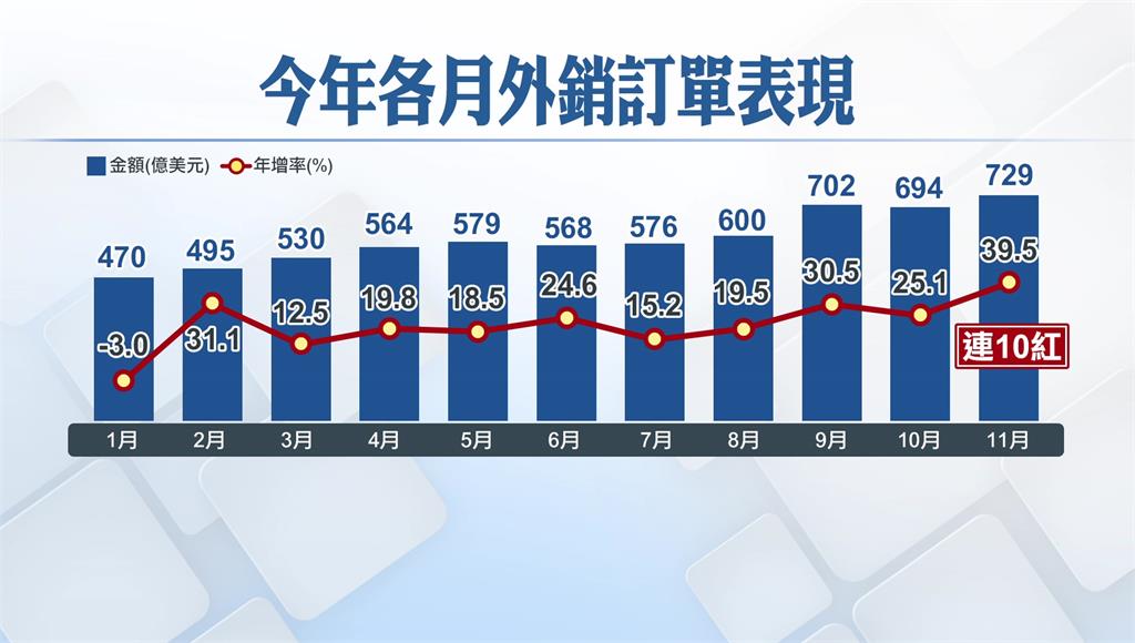 受惠AI需求不墜,台灣11月外銷訂單金額為729.2億美元,呈現連續10個月正成長;經濟部預期,12月訂單動能也會持續,可望維持年增近4成的好表現,且2025年全年接單金額,很有機會突破7000億美元大關。