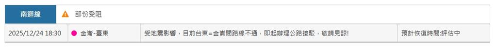 台鐵台東到金崙間路線不通。圖/翻攝自台鐵官網今(24)日17:47台東縣卑南鄉發生規模6.1地震,最大震度達5弱。受地震影響,變電站跳電、電力跳脫,列車依照SOP停駛.關山經台東到金崙間路線不通,台鐵也辦理公路接駁,並成立一級緊急應變小組。