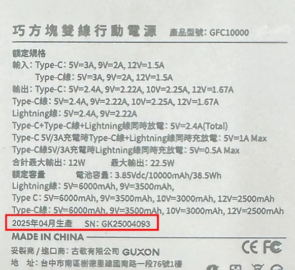 GUXON召回GFC10000巧方塊雙線行動電源。圖/翻攝自GUXON官網GUXON發出公告,表示旗下GFC10000巧方塊雙線行動電源之特定批次(批號:GK25004093),因電芯原料供應商未經核准自行更換原料,致特定批次產品的電芯原料與原先驗證條件存在差異,在特定情況下,可能導致極少數產品內部隔膜絕緣性能下降,進而產生潛在安全風險。