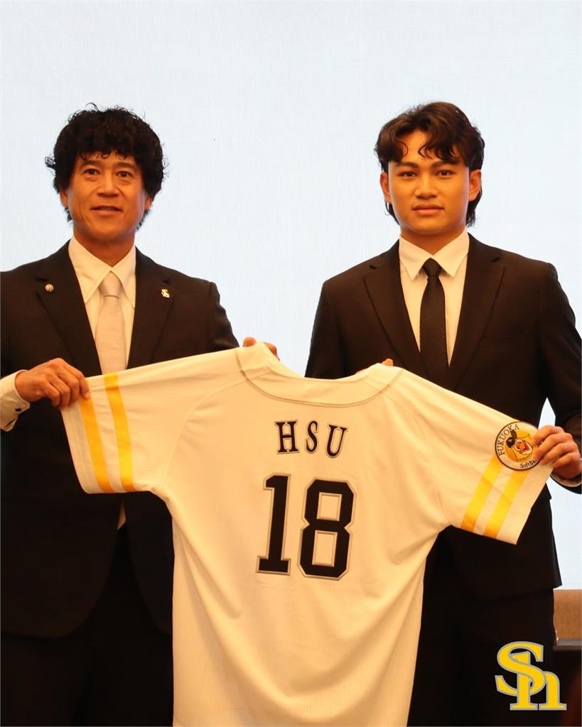 徐若熙明年新球季將帶著背號「18」前往日職,挑戰更高殿堂,今天舉辦加盟軟銀鷹記者會,中職會長蔡其昌、味全創辦人魏應充、總教練葉君璋,日方則有城島健司、總經理GM三笠衫彥等高層都慎重出席。