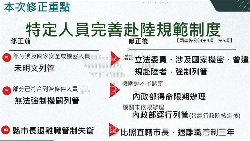 特定人員完善赴陸規範制度。圖/陸委會提供第三、對於應提列為赴陸管制人員,機關遲不予認定,內政部得命限期辦理,如未依限辦理將由內政部逕行列管;第四、民選公職人員赴陸接觸中共黨政軍,返臺時須提供時間、地點、事由、過程等資訊,由權責機關公開揭露,未提供或提供不實,處2萬元以上10萬元以下罰鍰。