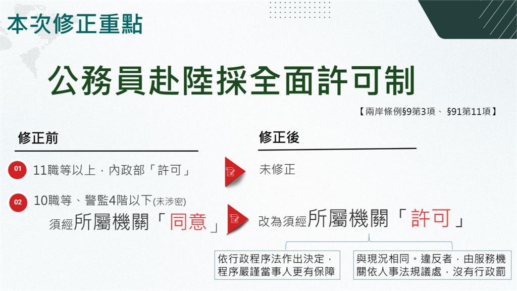 陸委會說明,依據總統提出5大國安威脅及17項因應策略指示,以及監察院提出公務員違法違規赴陸糾正案要求行政院改進,對此研擬兩岸條例部分條文修正草案,共有以下5項重點:第一,公務員赴陸採全面許可制,11職等、警監3階以上公務員維持現行規定,赴陸前向內政部申請許可;10職等、警監4階以下未涉密人員赴陸,須經所屬機關許可。