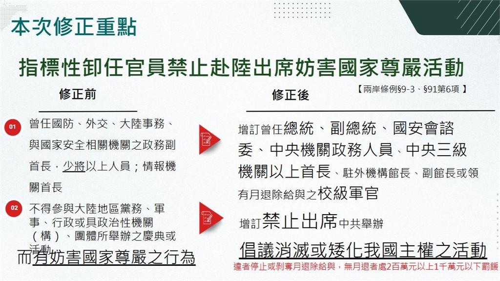 第五、指標性卸任官員禁止赴陸出席妨害國家尊嚴活動將擴大規範對象,增訂曾任總統、副總統、國安會諮委、中央機關政務人員、中央三級機關以上首長、駐外機構館長、副館長或領有月退除給與的校級軍官。受規範者也禁止出席中共舉辦倡議消滅或矮化我國主權之活動,違者停止或剝奪月退除給與,無月退者處2百萬元以上1千萬元以下罰鍰。