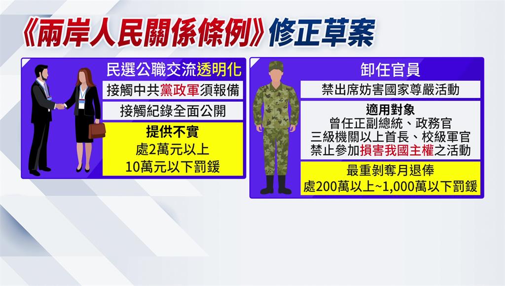 《兩岸人民關係條例》修正草案。圖/台視新聞製圖此外,所有民選公職人員赴中交流將全面「透明化」,若有接觸中共「黨、政、軍」相關人士,返台後須向權責機關申報接觸的時間、地點、事由及過程;若提供不實資訊或刻意隱瞞,將處以罰鍰。修法也增訂,曾任總統、副總統、政務人員及三級機關以上首長者,禁止出席損害我國主權的活動,違者將剝奪月退俸,或處最高一千萬元罰鍰。