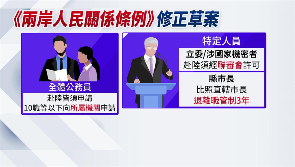 行政院拍板通過《兩岸人民關係條例》修正草案後,公務員赴中國將全面採取「許可制」。特定人員如立委及涉及國家機密人員,須經聯合審查會審查許可;縣市長則比照直轄市長,適用退離職後三年的赴中管制規定。