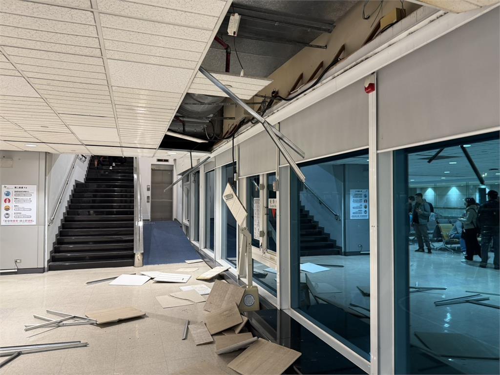 桃園機場第二航廈有多片天花板以及輕鋼架掉落。圖/台視新聞相關單位持續巡檢,並逐一排除安全疑慮。