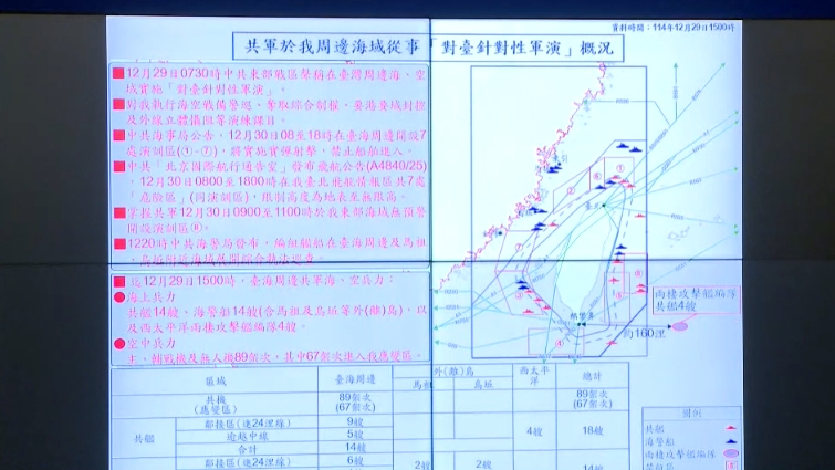 接著在8點18分左右,中共海事局發布公告,將從明天早上8點到下午6點在台海周邊,除了剛剛5個區域之外,另外增加了2個區域禁止船舶進入。隨後中共北京國際航行通告室也發出飛航公告,公告內容是12月30日早上8點到下午6點,在台北飛航情報區共7處危險區域,限制高度從地表到無限高,國防部今早也同步掌握共軍在東部海域增設1處演訓區域。