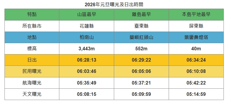 台北市立天文科學教育館公布曙光資訊,2026年全國第一道曙光將於清晨6點3分46秒出現在花蓮縣柏南山、最早日出也同樣在柏南山,將於6點28分13秒現身;若以較易抵達的平地而言,元旦最早曙光出現的地點在屏東鵝鑾鼻燈塔,民用曙光出現時間為6點10分08秒、日出時間為6點34分24秒;離島則以蘭嶼最早,曙光出現時間為6點05分06秒,日出時間為6點29分22秒,都是迎接新年第一道曙光的最佳選擇。