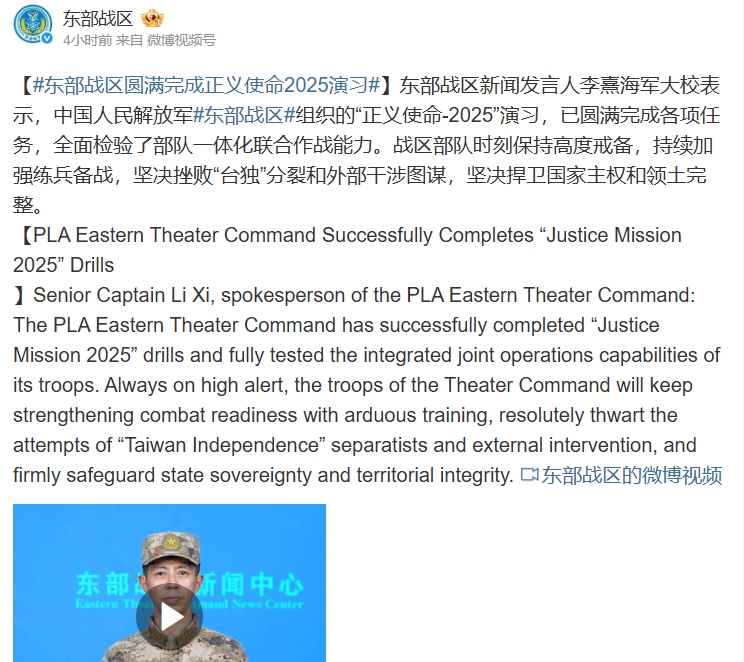 共軍宣稱演習已圓滿完成。圖/翻攝自東部戰區微博