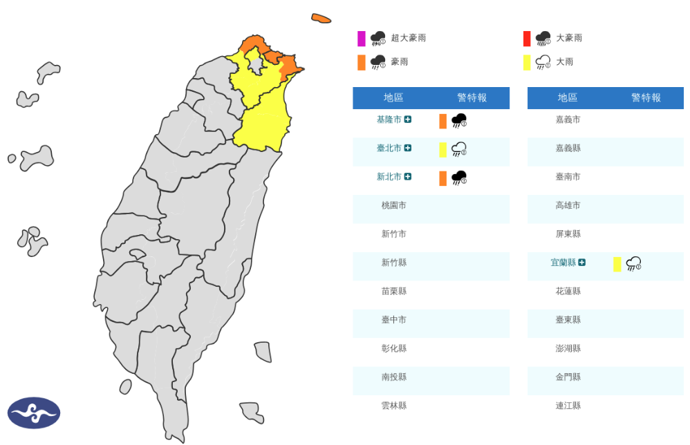 氣象署針對「4縣市」發布豪雨特報。圖/翻攝自中央氣象署網頁