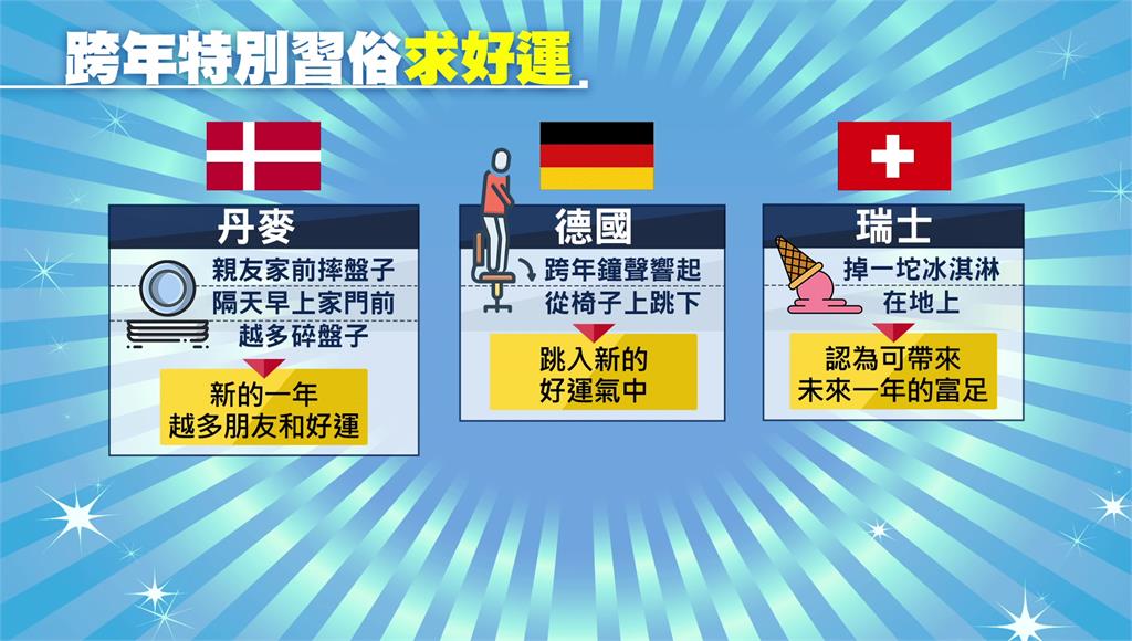 其實全球其實也有不少特別的跨年祈福習俗,像是丹麥會摔盤子,家門前越多碎盤子,就象徵新的一年越多朋友和好運;德國則是從椅子上跳下來,代表跳入新的好運氣中;瑞士則認為掉一坨冰淇淋在地上,可帶來未來一年的富足。