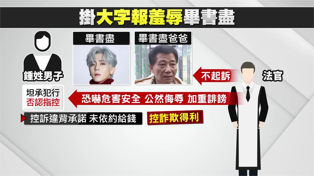 鍾姓男子分別在台北市西門町商圈忠孝東路二段及漢中街三度擺放大字報,並指名畢書盡「對待你的恩人你卻視若無睹,可悲可嘆呀」、「我能造就你也能毀了你」、「如今你功成名就,當初對我的承諾都可以完全背棄」,更辱罵畢書盡狼心狗肺。看到兒子被公然汙辱,畢書盡爸爸也心痛地說,「看了一半就看不下去了,內容很惡毒,所以我覺得120天應該的」。