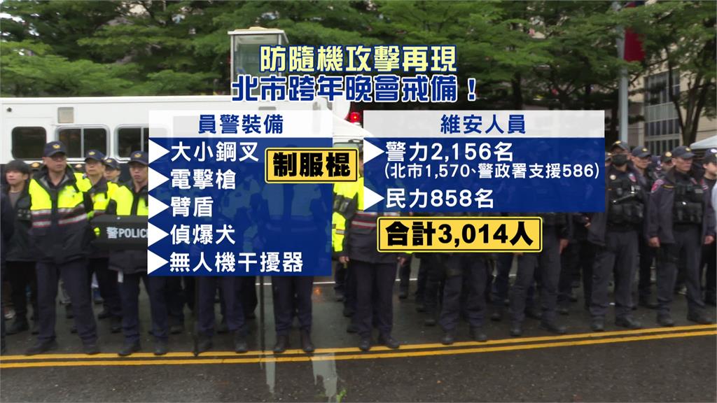 北市跨年晚會維安升級。圖/台視新聞製圖這回現場員警配備制服棍、大小鋼叉以及電擊棒、臂盾、無人機干擾器等,出動警力含北市和中央支援高達2156名,加上民力858名,合計3014人,就是要慎防隨機攻擊事件再度重演,還有現場緊急醫療救護同樣得要事前預備,就盼望2025年最後一天,所有市民都能安心迎接2026!