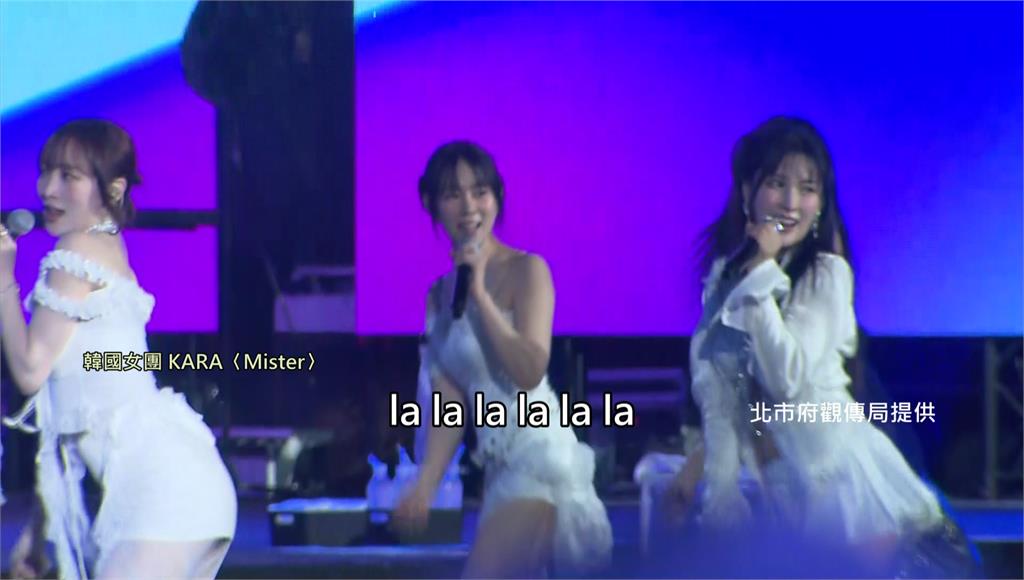 KARA睽違12年來台開唱,重現經典扭臀舞。圖/北市府觀傳局提供雖然天公不作美,台北跨年夜又濕又冷,但KARA 5位成員仍相當敬業,一席浪漫白色套裝,搭配甜美燦爛笑容,帶來一首首經典歌曲串燒,還重現經典扭臀舞,最強回憶殺讓台下嗨到最高點!另外,在韓國出道的人氣女團幻藍小熊,也一連帶來多首動感舞曲,青春洋溢,還驚喜與情歌王子畢書盡帶來聯合舞台。