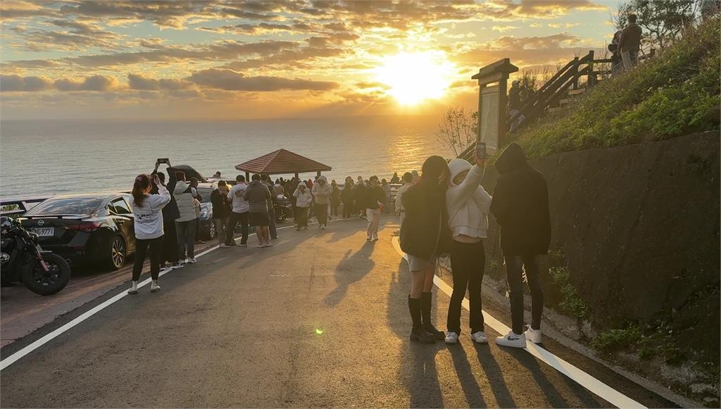 在台東南田觀景台,步道上站滿了人,雖然同樣沒能第一時間看到2026第一道曙光,但沒過多久金黃色光仍從雲層後方露出,灑落海面上。