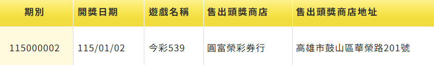 台彩。圖/台視新聞(資料畫面) 台灣彩券今(2)天公布第115000001期大樂透獎號,派彩結果出爐,頭獎槓龜無人中獎,下期頭獎保證1億;今彩539頭獎開出1注,獎落高雄鼓山區「圓富榮彩券行」,二獎開出193組,每注可獲得獎金2萬元。本期今彩539開出頭獎店家。圖/翻攝自台彩官網派彩結果及中獎號碼以台彩官網公布為主。責任編輯/蔡尚晉