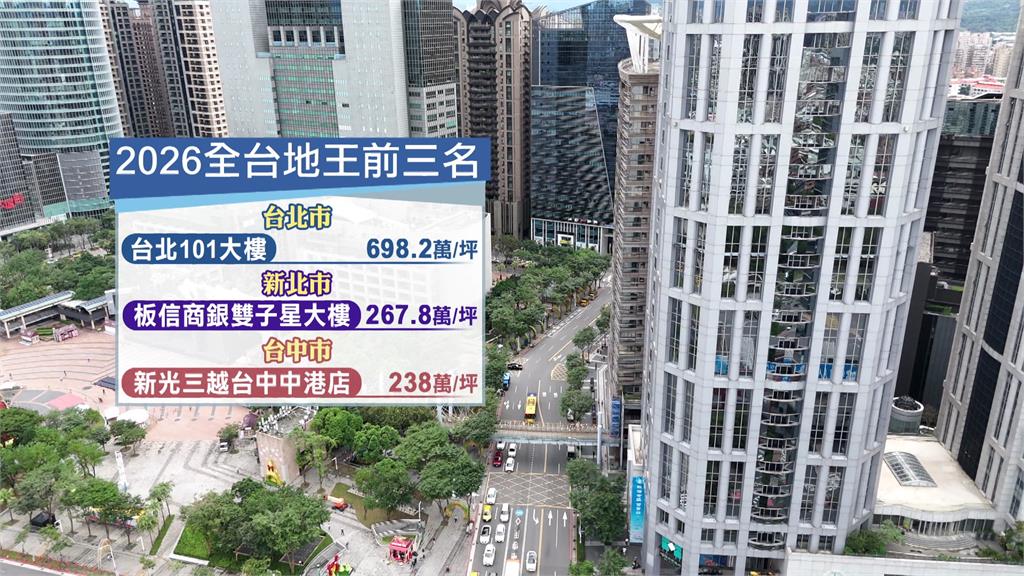 至於今年全台前三名的地王,台北由指標性建築101拿下,單價仍在高檔水位;新北板信商銀雙子星大樓也以每坪267.8萬元,連續17年成為新北地王;單價第三高的則是台中新光三越,每坪238萬拿下20連霸。