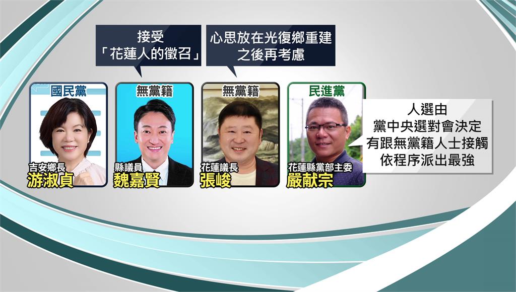 游淑貞、魏嘉賢、張峻都是參選花蓮縣長的可能人選。圖/台視新聞國民黨中央強調一切按制度走,而民進黨方面則不排除與無黨籍人士合作,只要能翻轉花蓮,任何選項都會考慮。