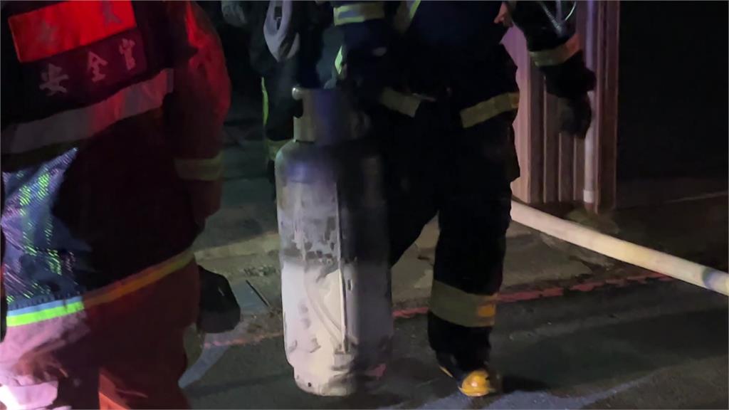消防人員發現一瓶瓦斯鋼瓶,瓶身有燃燒痕跡。圖/台視新聞