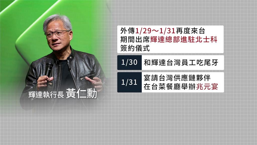 除了傳出黃仁勳本月29日至31日將再度來台,期間可能出席「輝達總部進駐北士科」簽約儀式外,1月30日也將與輝達台灣員工吃尾牙;隔天預計在老地方台菜餐廳宴請台灣供應鏈人士,重現「兆元宴」。