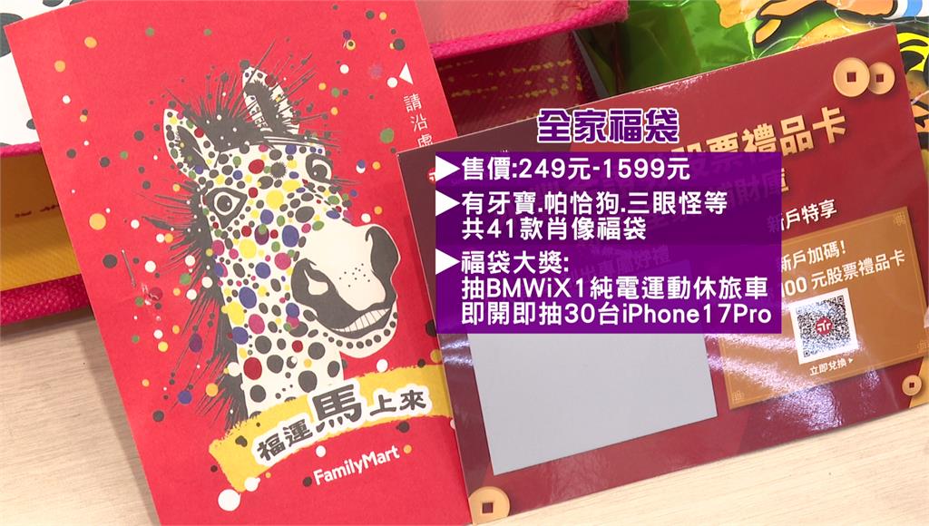 撕開喜氣洋洋的馬年福袋,零食、餅乾、飲料通通有,還有可愛的吉伊卡哇筆袋,迎來新的一年,超商福袋開賣,民眾搶試手氣,超可愛的牙寶、熊抱哥通通有,還有冬天最愛的毯子,通通是福袋內容,全家福袋這次一共有6種價格、41款,但大家最期待的還是抽獎券,有機會抽到價值199萬元的BMW休旅車,還有即開即抽30台iPhone 17 Pro也是一大亮點!