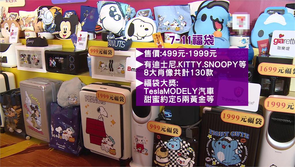 可愛福袋商機大,7-11也不遑多讓,有咖波棉被、Snoopy行李箱,還有蠟筆小新通通是聯名IP,共有8種IP、130款,福袋大獎則是特斯拉汽車,還有5兩黃金都很吸睛。
