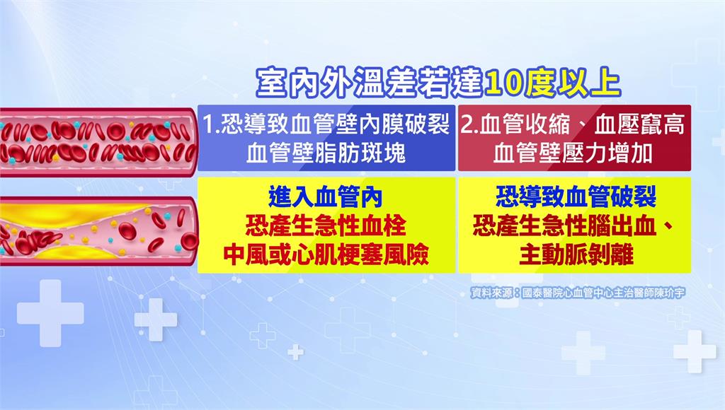 另外,溫差過大時,血管容易收縮、血壓竄高,血管壁壓力增加,更可能直接導致血管破裂,發生急性腦出血、主動脈剝離等症狀。