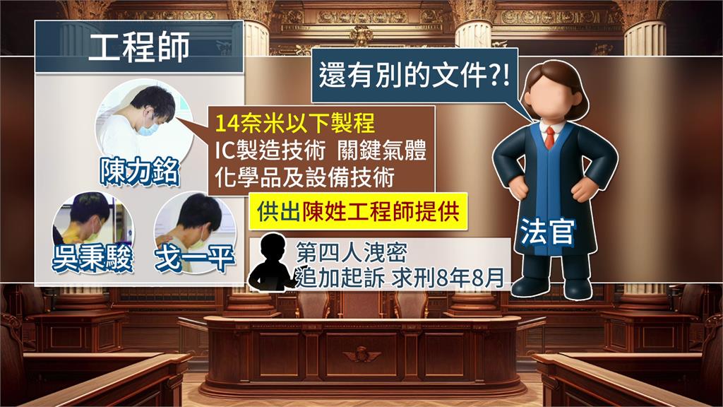 檢方在東京威力科創的檔案裏,發現2奈米以外的台積電資料,陳力銘直接供出,14奈米以下製程、IC製造技術還有關鍵氣體、化學品跟設備技術,是由另外一名在職的陳姓工程師提供。陳姓工程師被追加起訴,完全否認犯行被檢方認為態度欠佳,具體求刑8年8月。