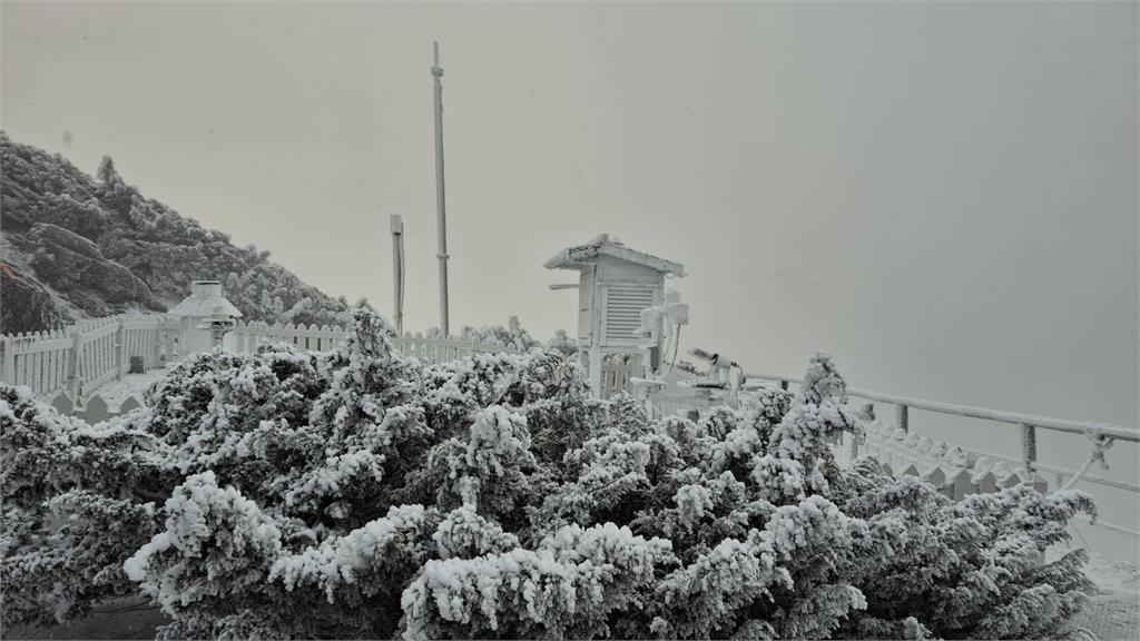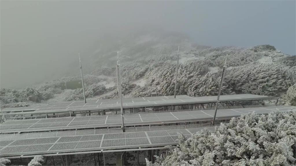 海拔3844公尺的玉山氣象站已成冰封世界。戶外的觀測儀器、太陽能板以及建築物屋頂被白雪覆蓋;氣象站前的招牌更結上一層冰霜。