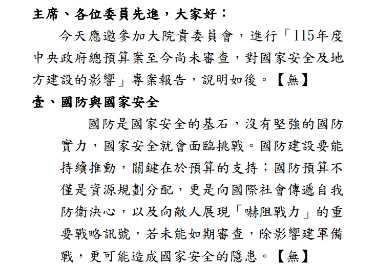 國防部先前實施新規,公文、訊息都必須逐段標註機密等級,還要逐段審查,若不涉及機密必須在段落後註明【無】,引發議論。國防部今(9)日表示,在收集各界回饋意見、研討後,決定內容不涉及「國家機密」或「一般公務機密」文件改為頁首標示【本件屬公開資訊】,而無須逐段標示【無】。