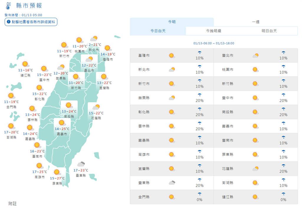 1/13全台天氣預報。圖/中央氣象署