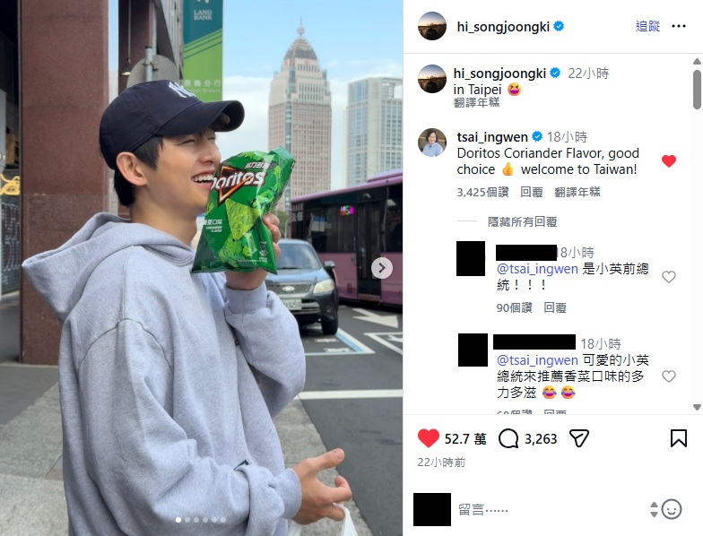 除此之外,宋仲基似乎也是香菜愛好者,他PO出買到多力多滋香菜口味的餅乾,笑到眼睛都看不見,十分喜愛的把餅乾放在嘴邊,而他的發文還意外釣出蔡英文本尊現身,留言大讚「多力多滋香菜口味是很棒的選擇,歡迎來台灣」,許多網友朝聖笑說「怎麼連宋仲基的版面都來了」、「小英怎麼海巡到這裡的」、「總統到處衝浪」。
