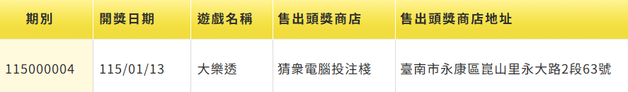 本期大樂透頭獎商店。圖/翻攝自台彩官網台彩1/13獎項獎號如下: