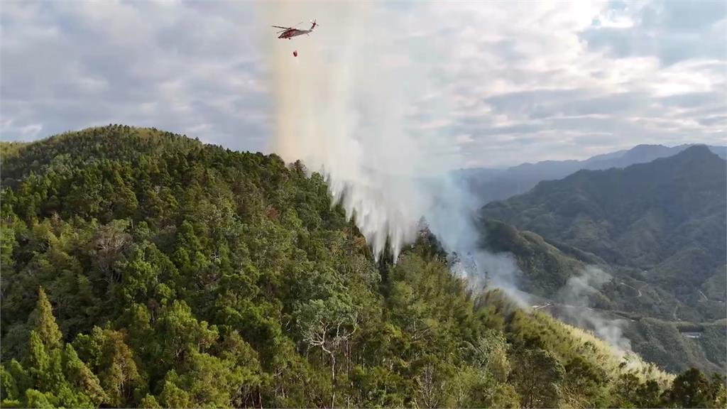 雲林縣古坑鄉草嶺石壁大飯店後方山林,昨(12)日上午接近8點時發生山林火警。消防隊獲報抵達現場後持續搶救。消防單位今(13)日評估,燃燒面積約5公頃,火勢一度有擴大延燒的趨勢,因應現場狀況加派人車到場、開闢防火通道,同時請求空勤總隊直升機支援灑水滅火,並協調嘉義林區管理處人力協助,全力防堵火勢持續蔓延。空勤總隊直升機支援灑水滅火。圖/台視新聞台視新聞/綜合報導 責任編輯/網路中心